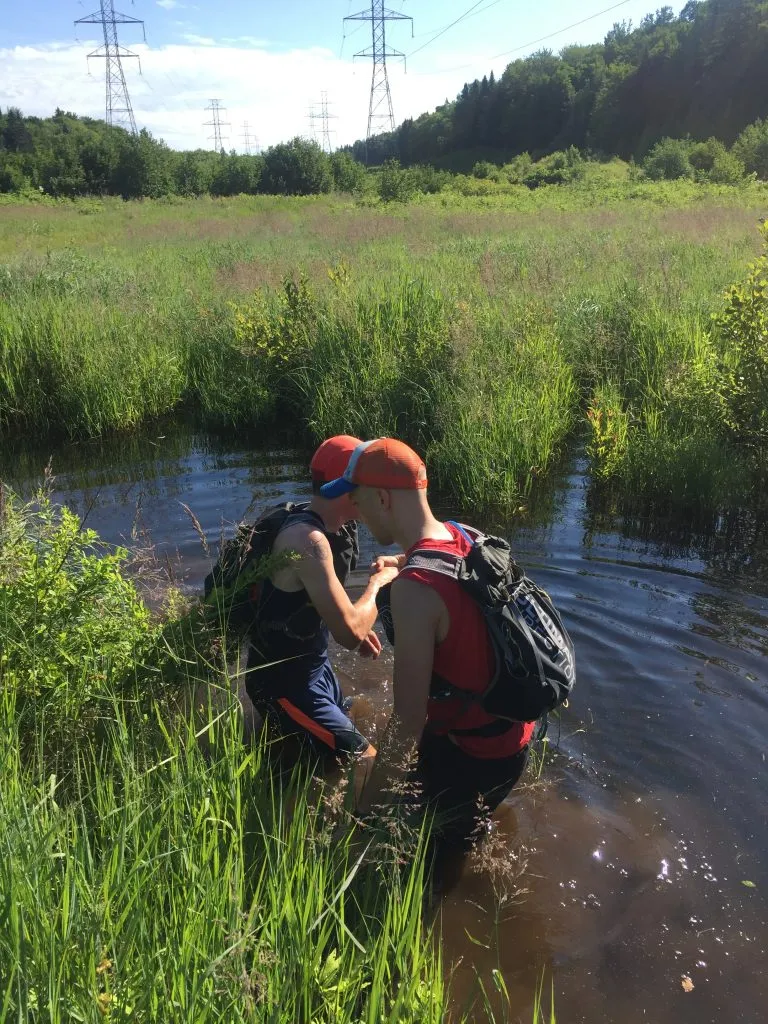 La journée s’annonce chaude, 32°C à son apogée en après-midi, et le sentier est pleinement exposé. Quarante kilomètres au soleil tapant. Pour ceux qui connaissent le secteur, c’est le sentier de VTT et de motoneige sous les lignes d’Hydro-Québec entre Beauport et la Côte-de-Beaupré. Un sentier souvent sablonneux, parfois rocailleux. Christian nous quitte au début du sentier et nous souhaite bonne chance. On poursuit avec Thomas A. qui, à son dire, est vraiment heureux de participer à cette aventure. Vers 8 h, on entre sur le site de l’ancien camping Plage-Fortier. Un vieux thermomètre indiquait déjà 27°C. Priorité à l’hydratation aujourd’hui, car un coup de chaleur pourrait compromettre le reste du périple. Mais il n’y a pas que des sentiers bouillants sur ce segments, il y a aussi une zone marécageuse où l’on a pas le choix de se mouiller… beaucoup!