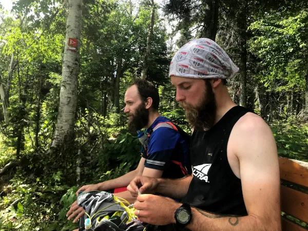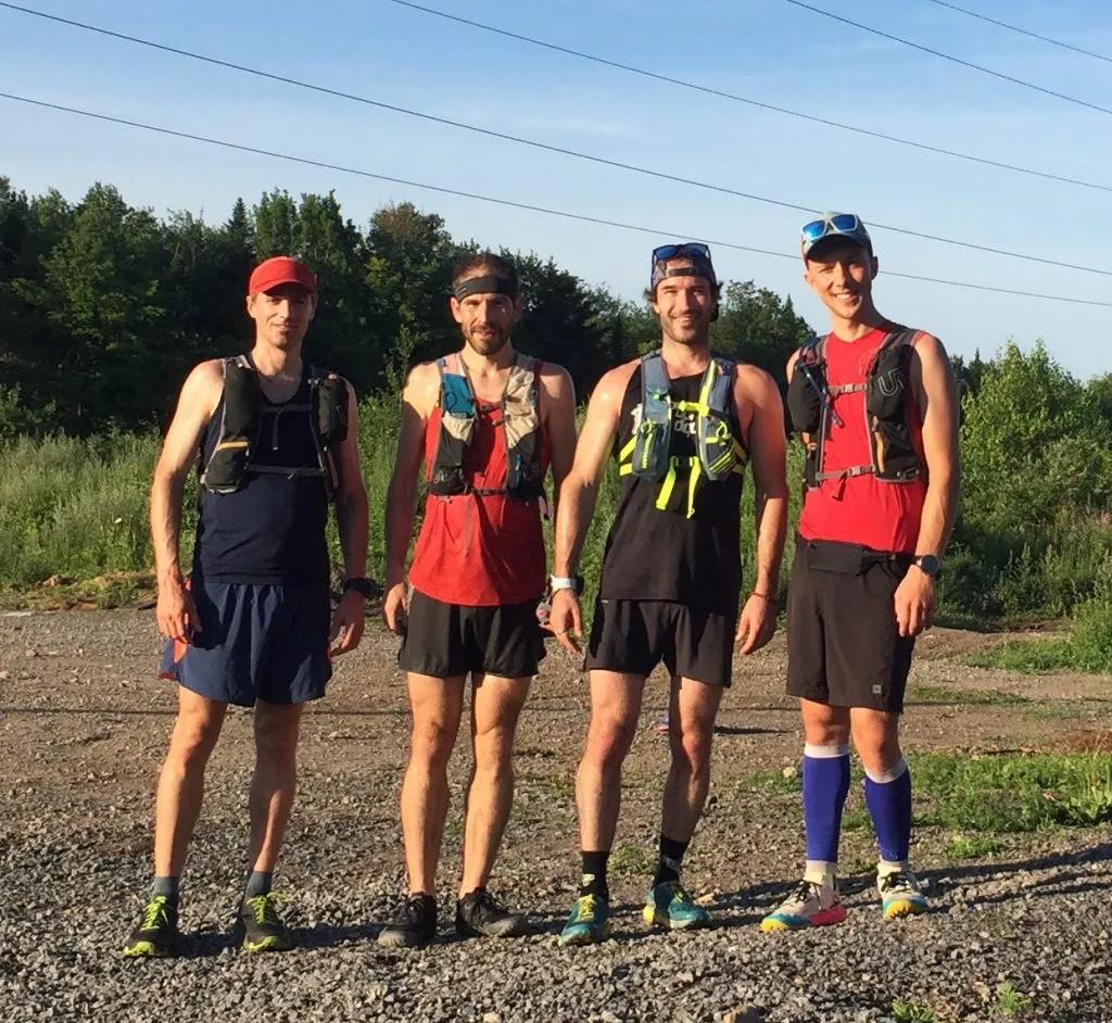 Le Sentier des Caps, on l’a fait plusieurs fois dans le passé et y retourner nous rend fébriles. Les conditions sont excellentes, le sentier est sec et le soleil commence à se pointer. Il y a des moustiques en quantité lorsque l’on s’arrête, mais je ne les sens même pas me piquer, les endorphines semblent masquer ces petites sensations. Mais c’est tout le contraire pour Thomas et Guillaume qui en profitent pour nous éduquer sur les jurons français de mise dans cette situation. On repart d’un bon pas en se laissant entraîner par nos pacers l’instant d’un peu de vitesse en sentier.