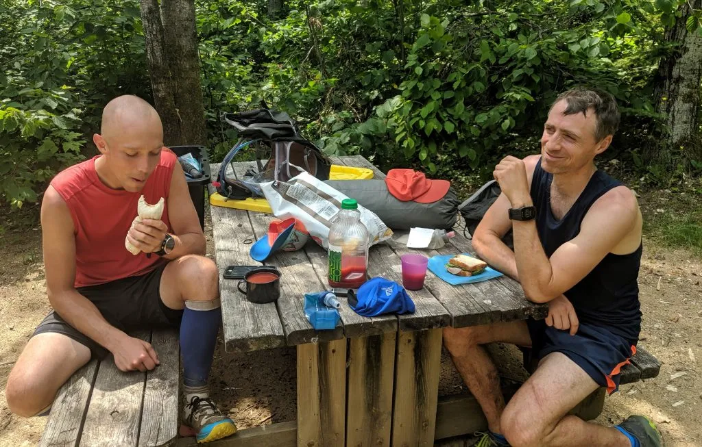 Vers le km 40, Nadia, la copine de Thomas A., nous accueille avec un ravito _tailgate : m_elon d’eau, popsicle, Gatorade, pain au beurre de peanut, et j’en passe, nous redonnent de l’énergie pour la suite. Dans sa grande sagesse avec la bouche pleine de barres Cliff, Matthieu nous lance: