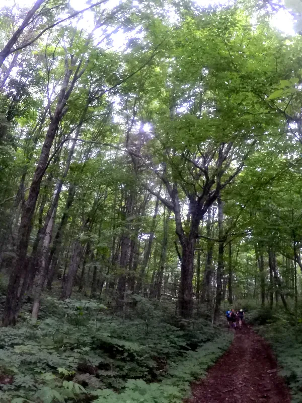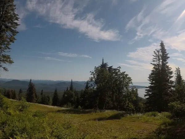 Arrivés en haut du mont, la vue panoramique est majestueuse. On voit clairement le fleuve, Baie-Saint-Paul, les cimes du parc des Grands-Jardin au nord et la vallée de la rivière du Gouffre que nous visiterons demain. Un randonneur y casse la croûte et en regardant son lunch me vient une une rage de fruits et légumes! Ça me motive à reprendre le sentier vers Baie-Saint-Paul, il reste environ 15 km à parcourir en empruntant chemins de terres et sentiers de motoneiges non balisés.