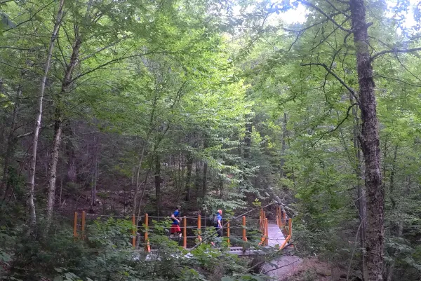 Suivre Thomas Duhamel et Guillaume Barry dans le sentier Mestashibo, c’est génial. On oublie les racines qui dévalent rapidement sous nos pieds pour nous concentrer sur les discussions de nos amis d’origine françaises, empreintes de bonhomie et de traits d’esprit à grande vitesse. Ce sentier a mauvaise réputation, on le redoute pour sa technicité. Pour ma part, bien au contraire, j’en tire un plaisir malin, car les magnifiques paysages embrumés de la région de Charlevoix s’ouvrent à nous. C’en est bientôt terminé du sentier Mestashibo, voilà un peu de bitume pour nous rendre à l’accueil du Sentier des Caps à St-Tite-des-Caps où l’on doit acquitter les droits d’accès.