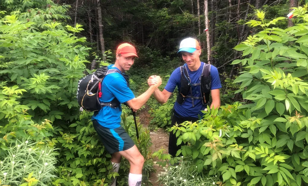 Le Sentier des Caps, on l’a fait plusieurs fois dans le passé et y retourner nous rend fébriles. Les conditions sont excellentes, le sentier est sec et le soleil commence à se pointer. Il y a des moustiques en quantité lorsque l’on s’arrête, mais je ne les sens même pas me piquer, les endorphines semblent masquer ces petites sensations. Mais c’est tout le contraire pour Thomas et Guillaume qui en profitent pour nous éduquer sur les jurons français de mise dans cette situation. On repart d’un bon pas en se laissant entraîner par nos pacers l’instant d’un peu de vitesse en sentier.