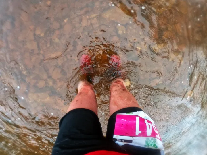 En arrivant au ravito de l’Anse à Beau-fils, j’ai croisé Yann qui repartait déjà. Sa conjointe Marianne était là; elle me donna un coup de main avec mon orteil. Avec toute la boue et les 2 traversées de rivière, mon bandage improvisé n’a pas tenu ben ben longtemps et la douleur ne faisait qu’empirer. C’est avec une belle catin de tape médical que je suis repartie à la poursuite de Yann. Cette fois, le bandage tiendra, Marianne a fait une maudite bonne job!