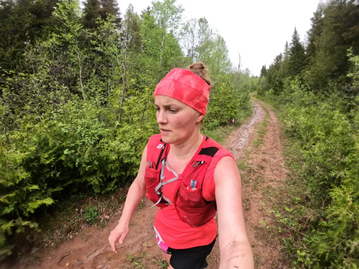 Un peu plus loin, mes ampoules récoltées un mois plus tôt à Bear Mountain, m’ont signifié clairement qu’elles n’étaient toujours pas guéries. La boue et l’eau depuis le départ n’ont pas aidé ma cause. Petit arrêt rapide au ravito de Val d’Espoir pour emballer mon orteil amoché et changer mes bas. Je me disais qu’après 18 km dans la boue, c’était sûrement fini. Et bien, je me trompais. Ça ne faisait pas 400 m que j’étais repartie, et déjà, mes bas secs étaient choses du passé.