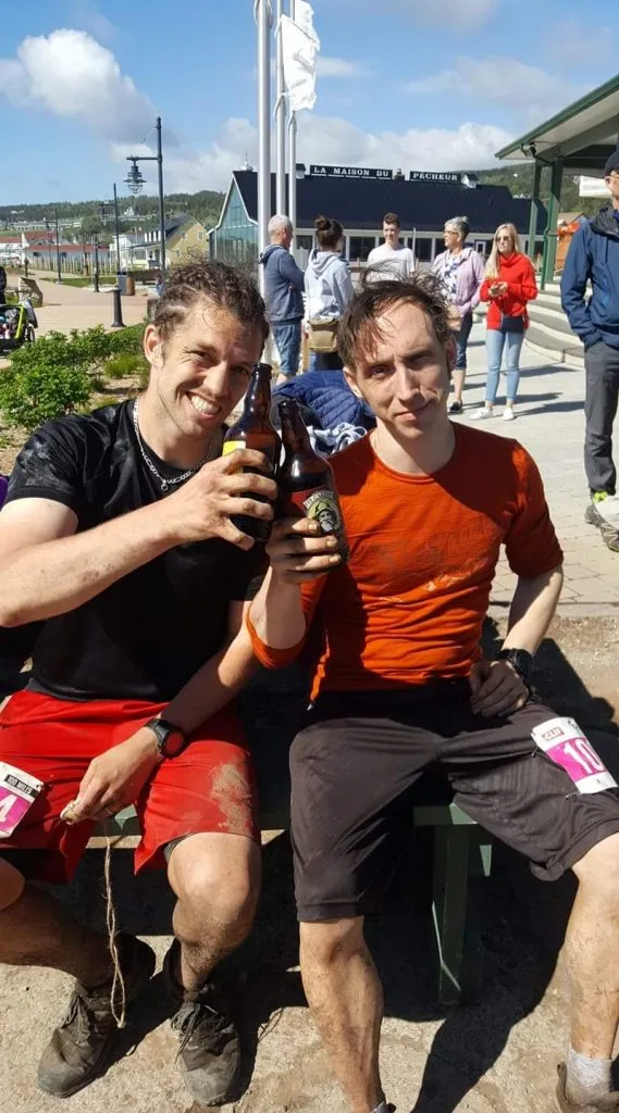 C’est vraiment bien de finir une course avec quelqu’un qu’on apprécie et j’oublie vite l’anxiété des dernières minutes. Math me tire jusqu’à l’arrivée.