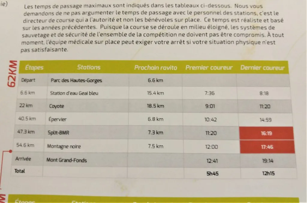 Les temps de passage (cut-off) des ravitos: en rouge !! (sinon: bye-bye)