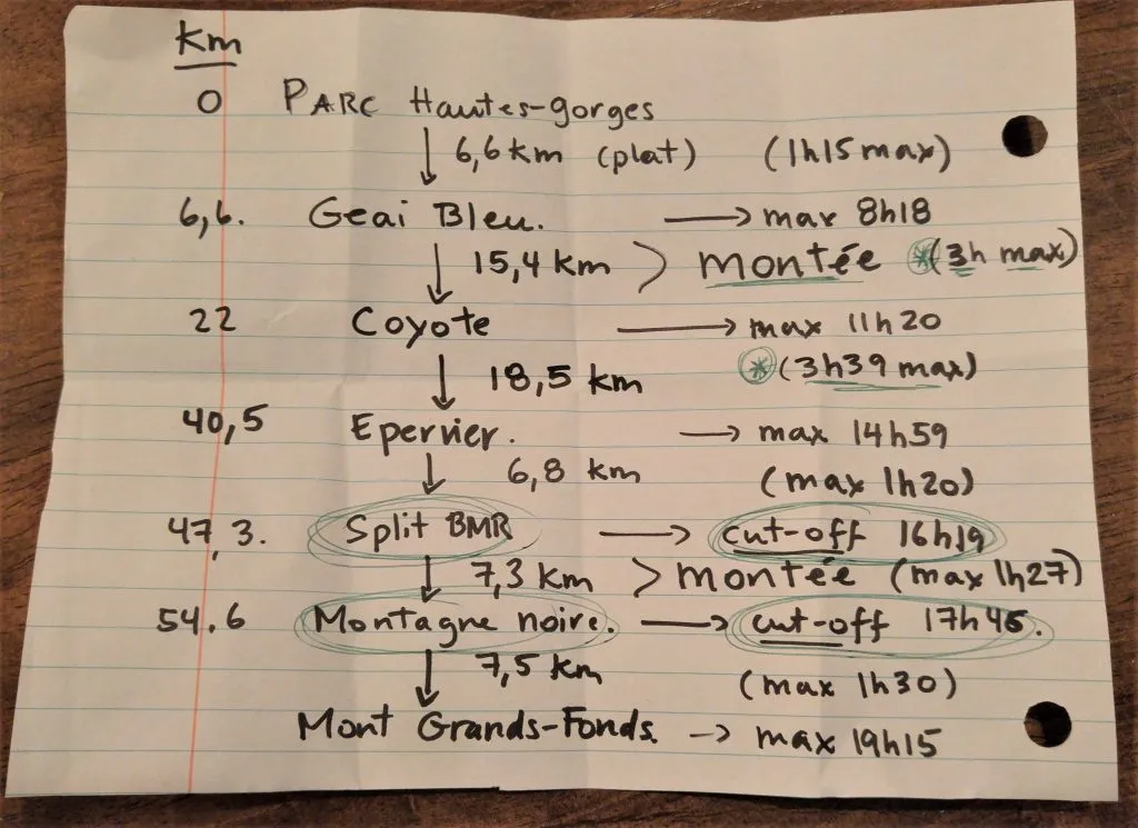 Je ferai donc le parcours avec comme seule indication : l’heure (donc sans mon «pace» de course, distance parcourue, ni dénivelé; des références qui auraient pu m’être bien utiles pour une course de cette envergure). Mais pas tout à fait, car j’avais pris le soin la veille de m’écrire au crayon feutre une feuille descriptive avec les temps de passages et distances. Ouf!, vive la prévention!