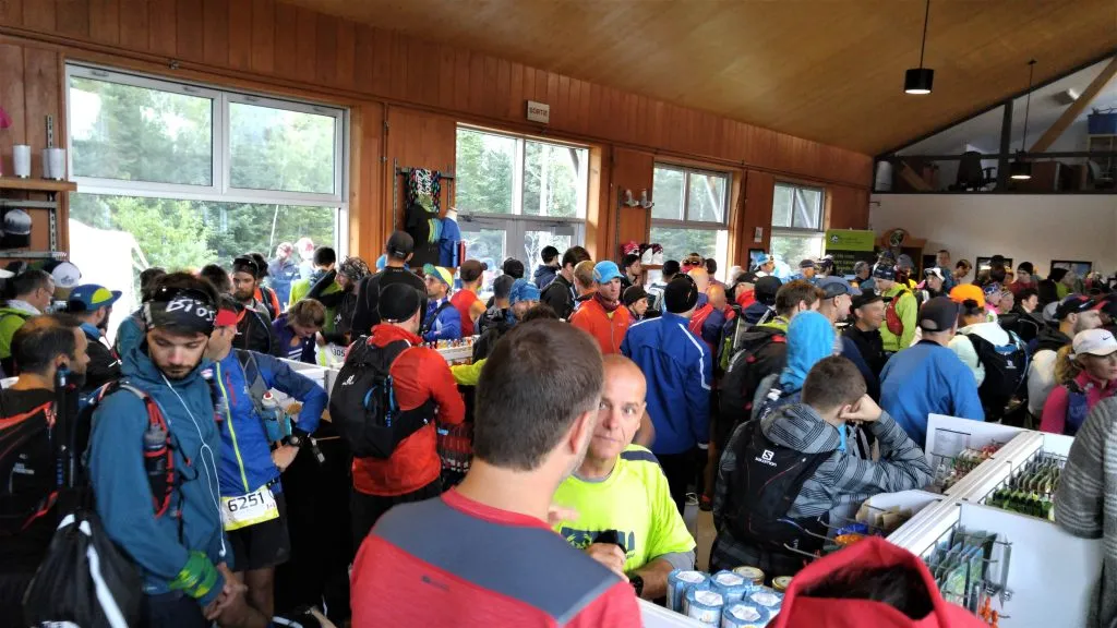 Au ravito du Coyote (km 22), après une montée qui s’est étirée sur 15,4 km, je prends le temps de m’assoir cinq minutes pour refaire mes réserves en énergie. On me sert un réconfortant bouillon de poulet chaud aux nouilles et gnocchis. Je complète avec des tartines au beurre d’arachide et un morceau de banane.