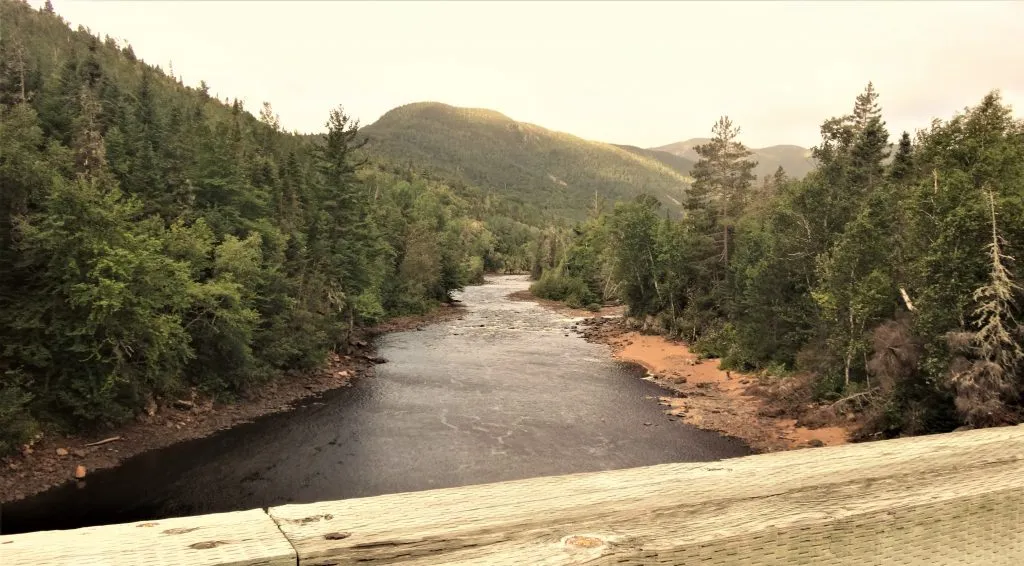 7 h : le départ est donné sous la musique de la cornemuse. Je commence à courir doucement dans le but de réchauffer mes muscles raidis par le froid matinal. Les premiers 5 km s’effectuent sur l’asphalte et rejoignent un grand pont traversant la Rivière Malbaie, dont je longerai une partie, pour ensuite pénétrer dans le magnifique sous-bois.
