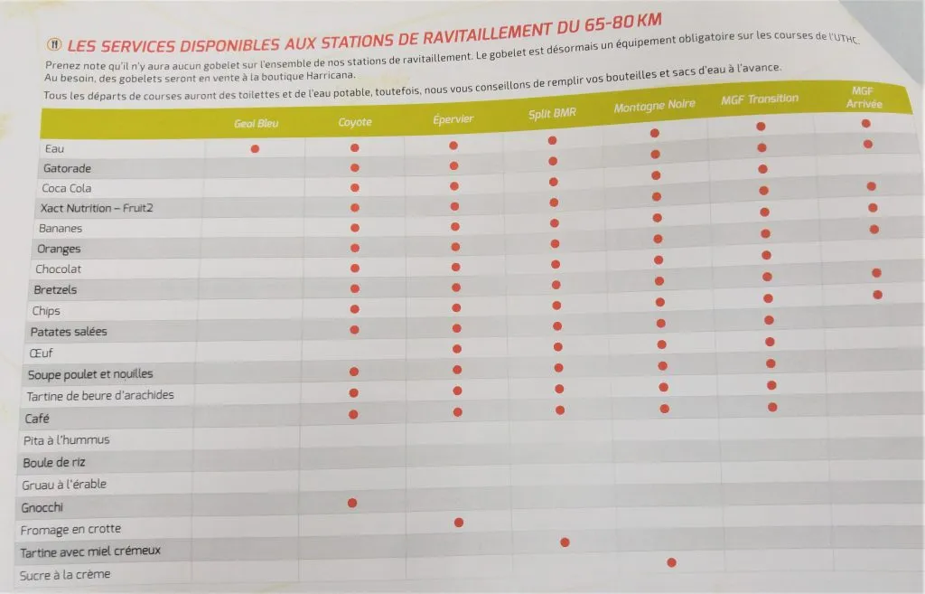 Je sens une petite douleur aux genoux qui s’installe. Je sors ma petite trousse d’huiles essentielles et j’applique, en prévention, mon mélange Deep blue de doTERRA (huiles essentielles de grade thérapeutique) qui me soulagera jusqu’au 50e km. J’enfile également mes gants chauds, car je réalise que j’ai les mains gelées (je les garderai jusqu’à la fin). Il est 11 h 13. Voici un tableau avec les aliments et boissons aux différentes stations de ravitaillement, tenues par de généreux et patients bénévoles. Merci.