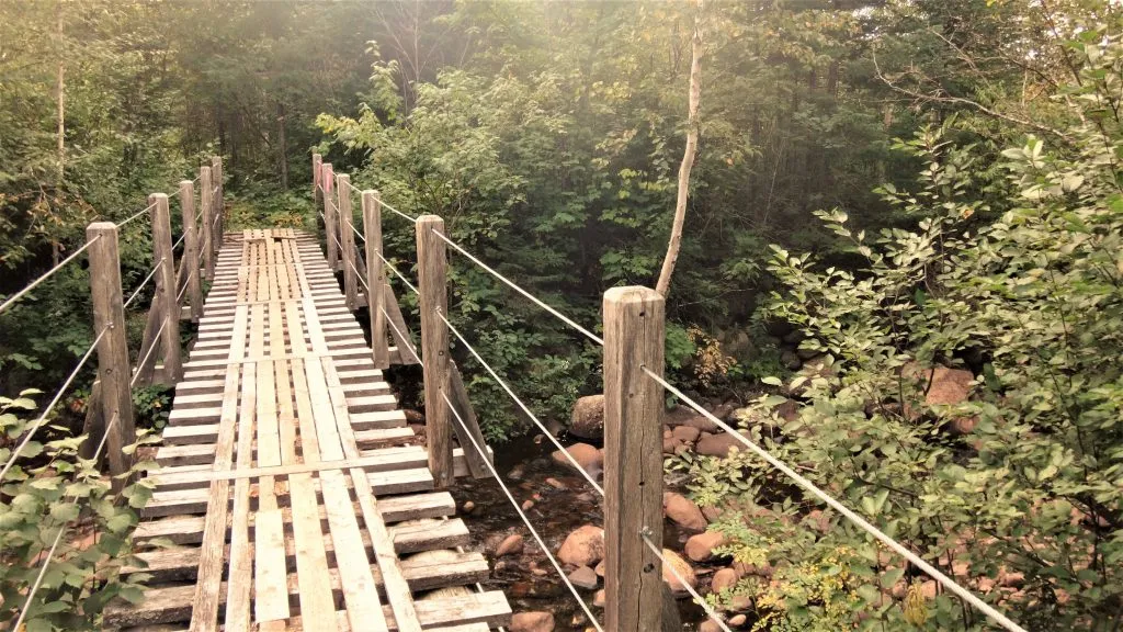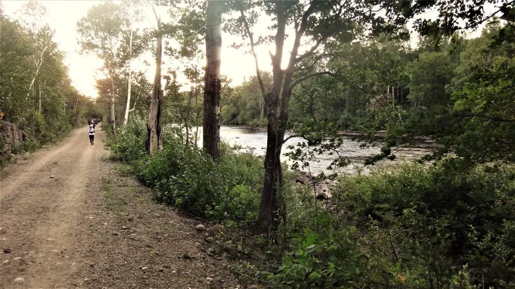 7 h : le départ est donné sous la musique de la cornemuse. Je commence à courir doucement dans le but de réchauffer mes muscles raidis par le froid matinal. Les premiers 5 km s’effectuent sur l’asphalte et rejoignent un grand pont traversant la Rivière Malbaie, dont je longerai une partie, pour ensuite pénétrer dans le magnifique sous-bois.