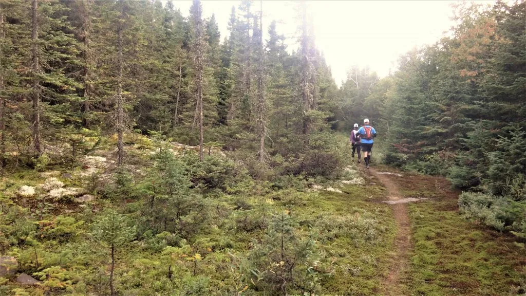 Précédemment dans le sentier (entre les stations de ravitaillement du Geai bleu et du Coyote), j’ai eu le bonheur de parcourir quelques kilomètres avec un sympathique monsieur, Marc, qui marche et court d’une allure constante tout en s’économisant pour la suite (il connait le parcours). Comme nous avons tous les deux environ la même cadence, on se suit et jase un certain moment,…combien de temps? 30 min? 1 h? Je ne sais pas…on finit par perdre la notion du temps dans ces courses-là. Marc prendra finalement de l’avance sur moi alors que je ralentis mon allure pour consommer un gel d’énergie à la mangue et banane (il est 9 h : ma banane commence à être loin!).
