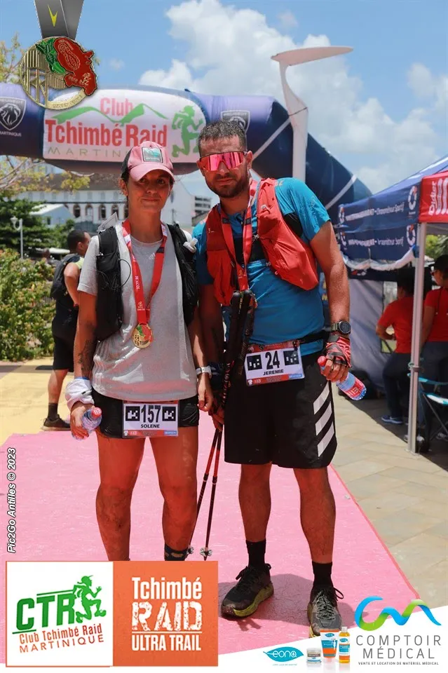 Au stade de Saint-Pierre, qui commémore ce même week-end les 121 ans de la catastrophe de 1902, 130 raideurs/euses prennent le départ vers la grande coupable de ce drame, la montagne Pelée dont l’éruption au début du XXème siècle avait rayé de la carte la principale ville de l’île à l’époque et pris en quelques secondes presque 30000 vies dans son souffle brûlant. 130 coureurs dont la légende Ludovic Pommeret (vainqueur notamment de la Diagonale des Fous, de l’UTMB, de la TDS…) et son épouse, venus se confronter au champion local, tenant du titre et ami Jordan Mionzé. Et il y a évidemment parmi ces participantes Solène, mon épouse, qui va quant à elle tenter de prendre un troisième Tchimbé, excusez du peu.