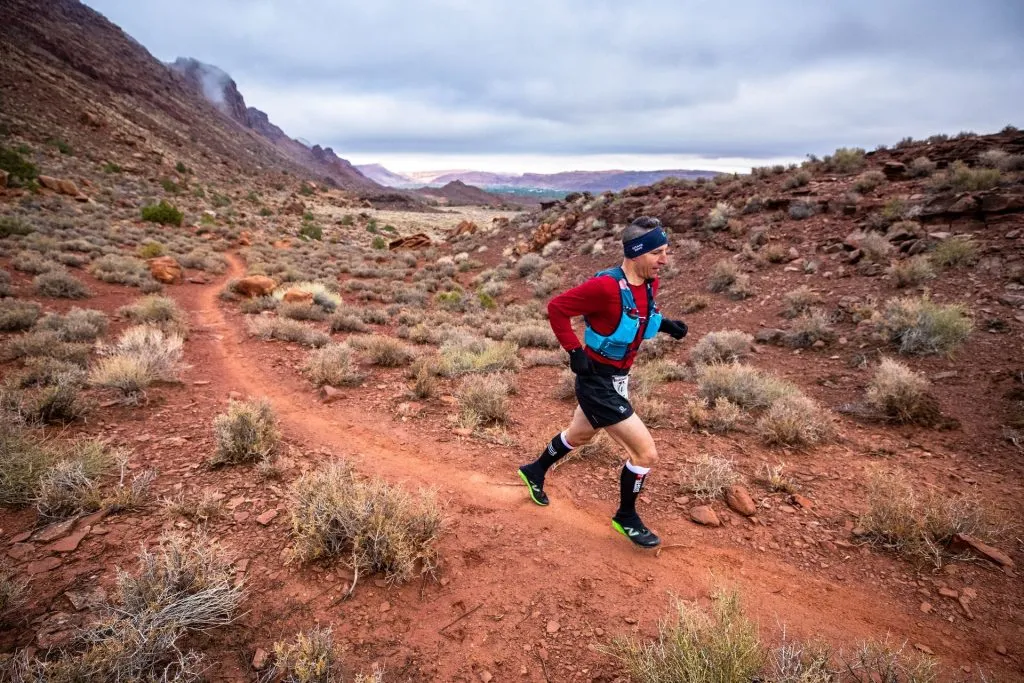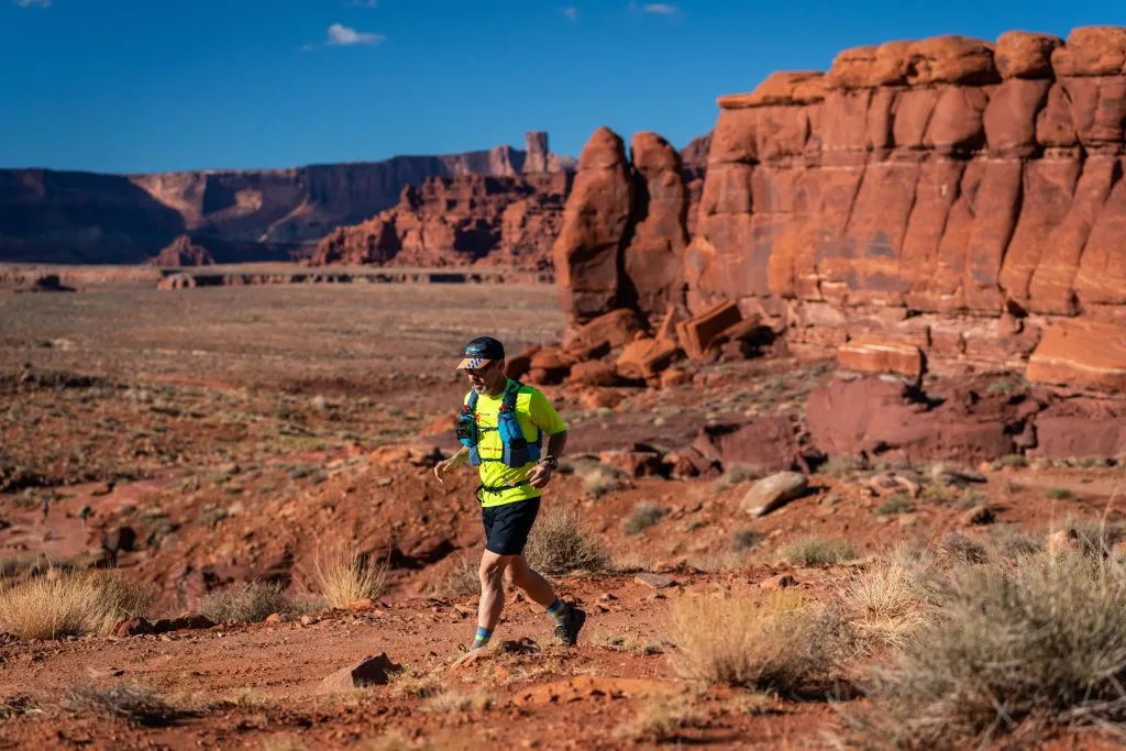 Le Moab 240 est un long parcours qui est assez courable, peu technique comparativement à ce qu’on connaît au Québec (courable à 90%), mais qui renferme d’autres types de défi. La chaleur peut être accablante, le froid cinglant. Comme on l’a déjà lu souvent, ce genre de désert est l’endroit typique ou tu peux avoir une engelure aux pieds (à l’ombre) et un coup de chaleur à la tête (au soleil), en même temps. On confirme : les écarts de température sont grands et très soudains. D’où l’importance de très bien planifier son matériel et d’être prêt pour toutes les intempéries.