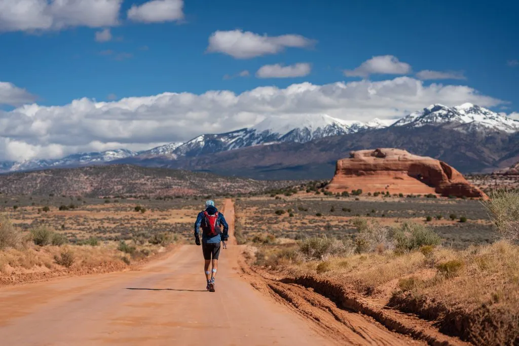Donc après avoir traversé le magnifique parc national Canyonlands, nous affrontons la première chaine de montagne à traverser (Shay Mountain). Au sommet, on aperçoit au loin le plus gros défi de la course : la traversée des La Sal Mountains.