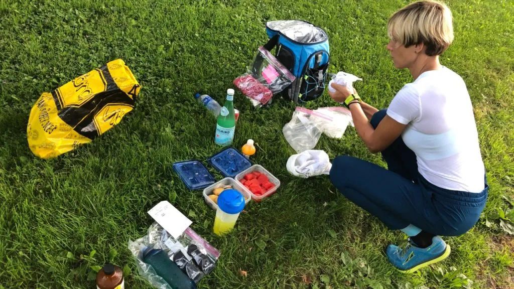 Qu’est-ce qu’un champion végétarien boit et mange à un point de ravitaillement ? Rien de bien spécial : eau minérale; jus d’orange bio; Kombucha bio; coca; eau avec de l’électrolyte; gel énergétique; patate bouillie salée; melon d’eau.