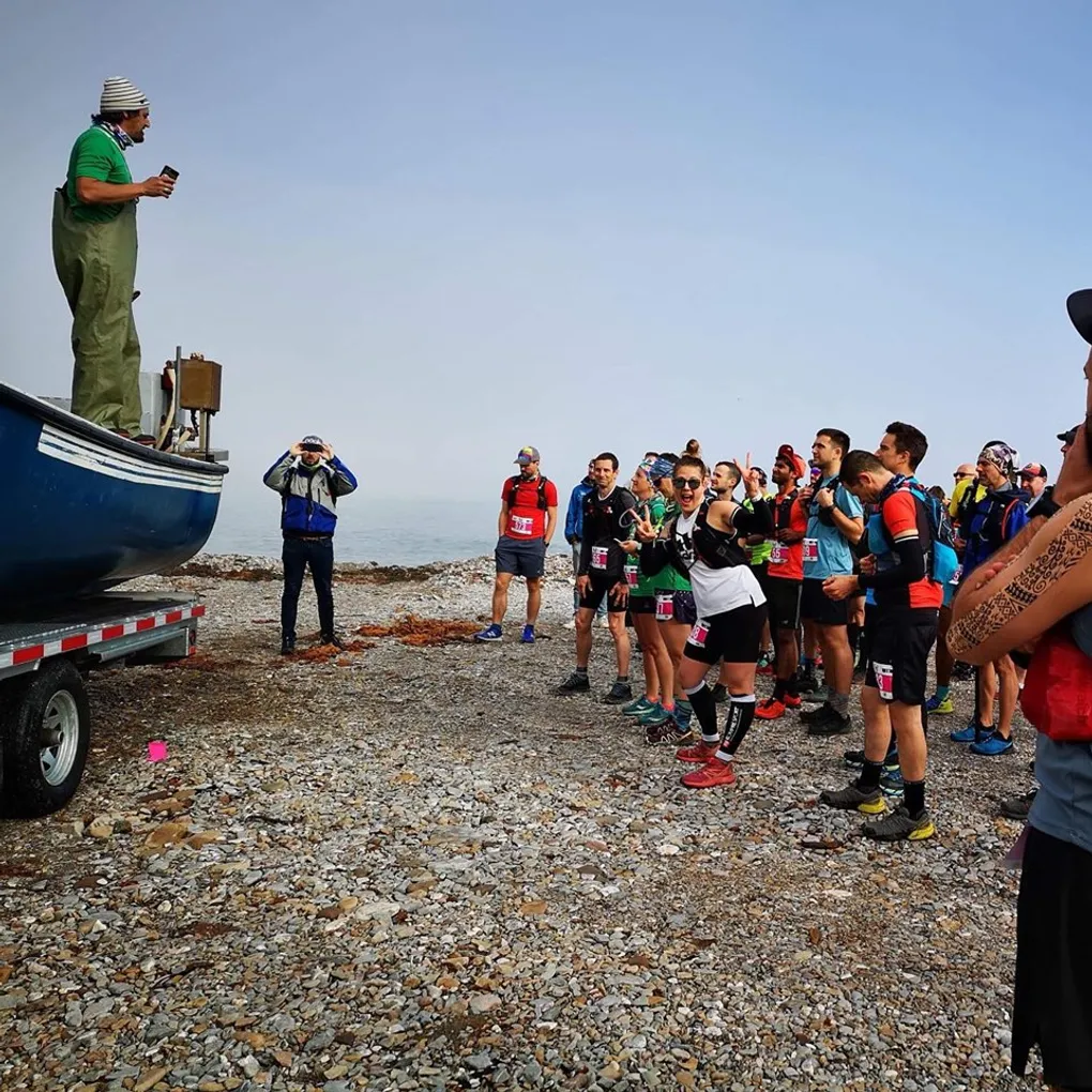 Tout commence samedi le 15 juin à 7 h 00. Le directeur de course, Jean-François Tapp, est vêtu de sa salopette de pêcheur (un classique). Il nous fait son discours d’avant course à bord d’un bateau de pêche aux homards. Le mot d’ordre : prudence. Les sentiers sont boueux à l’extrême et déjà une coureuse du 100 miles est mise à l’arrêt : épaule disloquée par une chute banale, mais brutale sur une racine glissante.