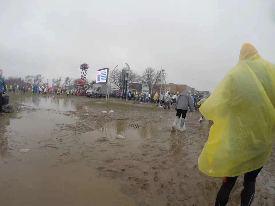 Le village des athlètes est situé dans une cour d’école. C’est normalement un superbe endroit gazonné pour relaxer avant la course. Cette année, c’est qu’un grand champ de boue.