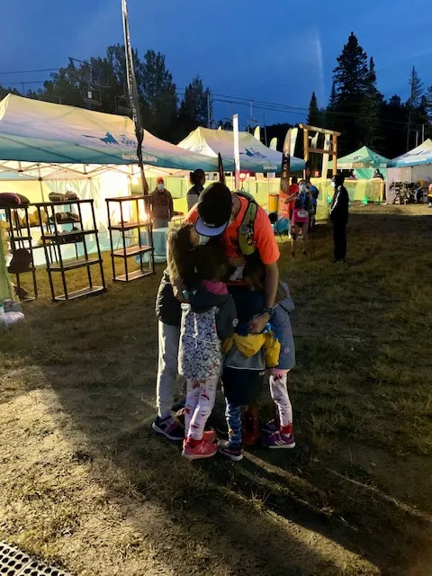 Mais à mon plus grand bonheur, je me souviendrai par contre que j’étais si confortable collé à mes filles la veille de la course, que j’étais bien et en confiance avant le départ, que mon mental était tellement solide que j’ai su poursuivre mon chemin sans douter une seconde de moi, que les cris des mes enfants, ma famille étaient si réconfortant à mi-chemin et qu’ils ont été parfait me redonnant vie pour repartir à l’aventure, que finalement mes patates, Coke et bouillon étaient la recette parfaite pour ma journée en forêt, et que malgré tout j’ai avancé sans trébucher et sans jamais m’arrêter mentalement, que j’ai vu une multitude de personnes que j’aime et que finalement je n’ai jamais été vraiment seul dans ce long et magnifique périple.