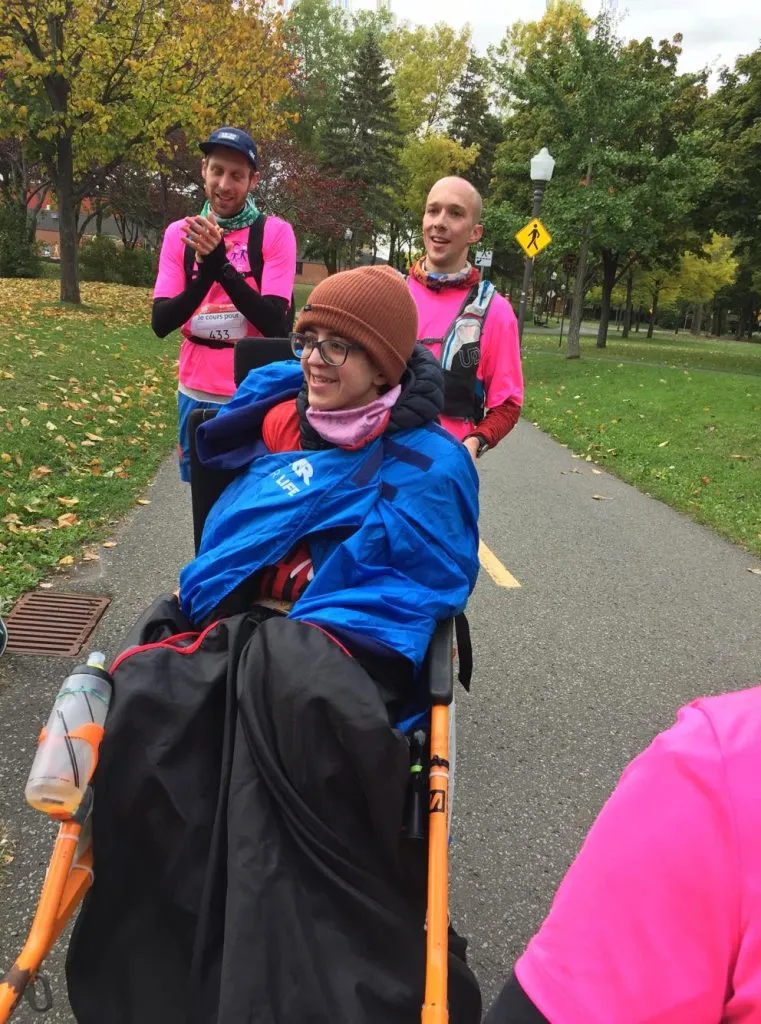 Non seulement ce champion veut finir cette aventure avec toute l’équipe, mais il refuse de monter dans la joelette pour courir les derniers mètres. C’est toute une vague d’émotions qui embarque, entre la peur de le voir tomber de fatigue et la joie de le voir courir à nos côtés.