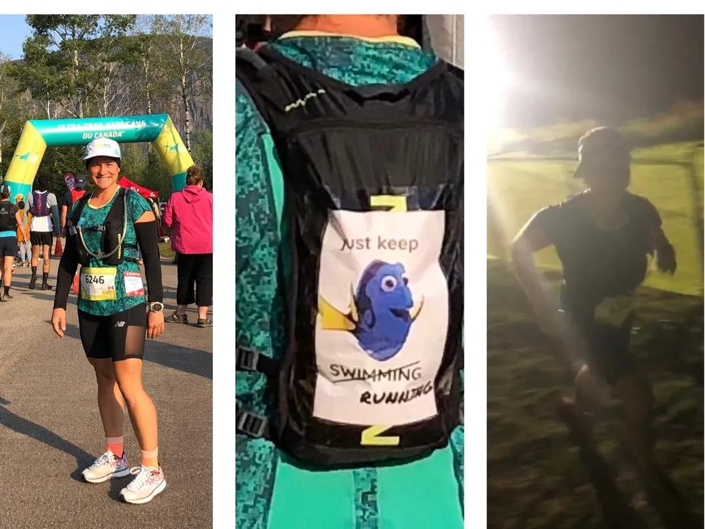 C’est mon premier ultra-marathon! Je suis fébrile! Sur la route menant au point de départ, je revérifie mon matériel pour la 800e fois. Tout est là et chaque item est à sa place. J’ai apposé sur mon sac une image de Dory du film Finding Nemo avec la citation Just keep swimming RUNNING. L’émotion monte soudainement… Et si je n’y arrivais pas? Ouf! C’est fou à quel point nos pensées engendrent nos émotions. Je suis contente que les enfants aient choisi de rester au chalet pour faire la grasse matinée… Je suis seule avec mon amoureux qui m’enveloppe de ses paroles encourageantes et son regard tendre.